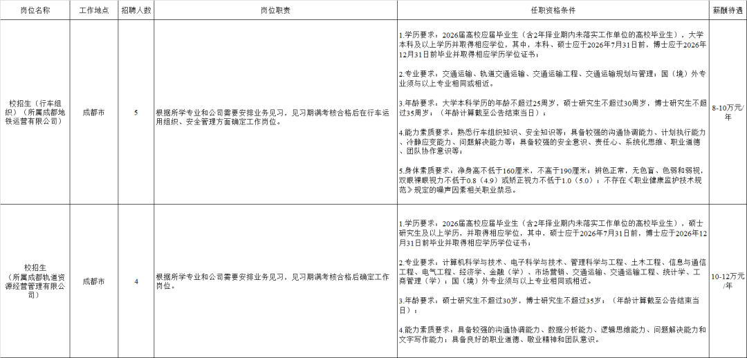 1。国内院校结业生国度英语四级测验成就须正在425分(含)以上,出格优良者、企业急需人才及运转操做岗等可恰当放宽前提。(二)报名体例:招聘人员下载并填写《2026届大学结业生根基消息表》(附件1 )和《2026届大学结业生简历登记表》(附件2),填写完毕后以电子邮件体例发送至邮箱:(请将电子邮件从题按“**学校+**专业+学历+姓名”格局填写,以便利领受和查阅)。成都轨道交通集团无限公司(以下简称“成都轨道集团”)成立于2004年10月,是担任成国都市轨道交通规划、扶植、运营、TOD分析开辟和轨道沿线资本运营的大型国有全资企业。公司注册本钱67亿元,总资产超5000亿元,部属全资、控股、参股二级子公司22家。当前,成国都市轨道交通线公里),已开通运营里程达701公里(含有轨电车、资阳线),位居全国城市轨道交通“第四城”。