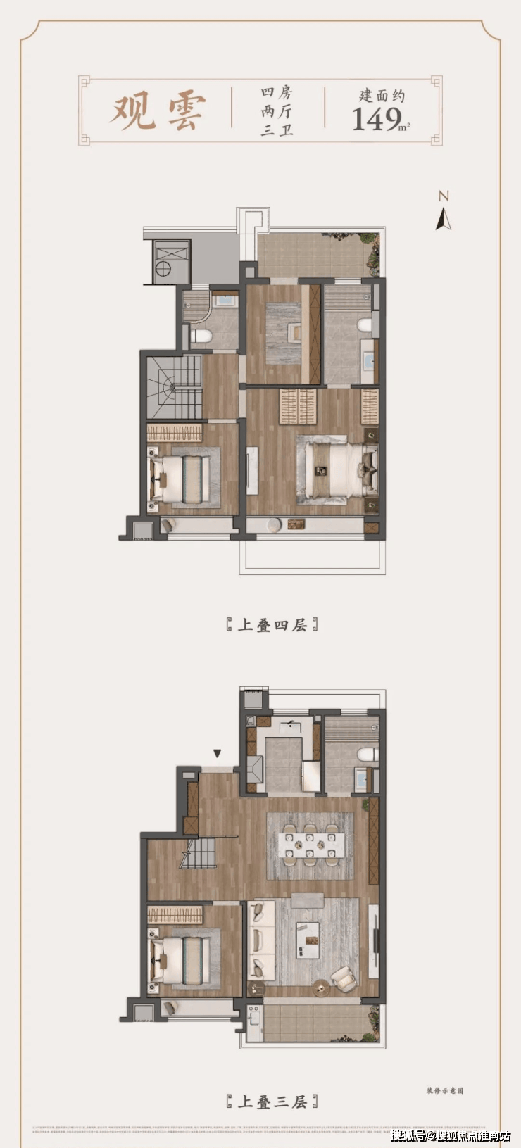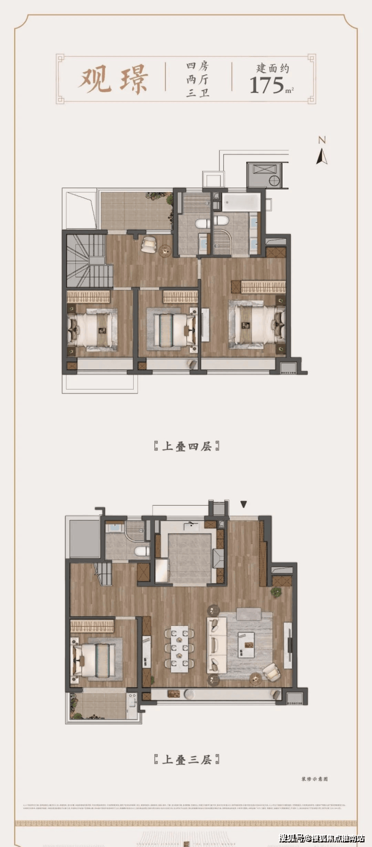 项目采用三段式入户:一进辋川入画(从入口空间),二进:闲庭碎影(戏台天井),三进:临风听湖(天然天井)。入院后有一副唐风画做,其次以亭台楼榭、理水叠山的中国园林意境,沉现盛唐大明宫百花斗丽,小桥流水,落叶如金的景不雅。社区景不雅层层递进,让住户置身此中,体验唐风山川。【建发不雅唐府】的部门楼栋还将打制从题式架空层,完美社区会客堂等功能,设置书法室、阅读、棋牌室等从题空间,建立全龄社交糊口场。户型方面,建发不雅唐府凸显两个劣势:设想优良以及户型品种多,选择面大。项目推出户型为约180㎡4房高层、约147-175㎡叠墅。