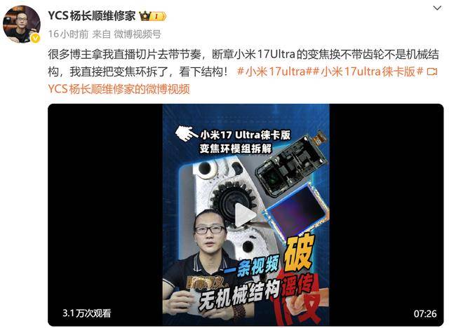 拆机博从“YCS杨长顺维修家”后续也已通过拆解的视频进行申明,其视频本意为展现内部布局,并非质疑变焦环实正在性。