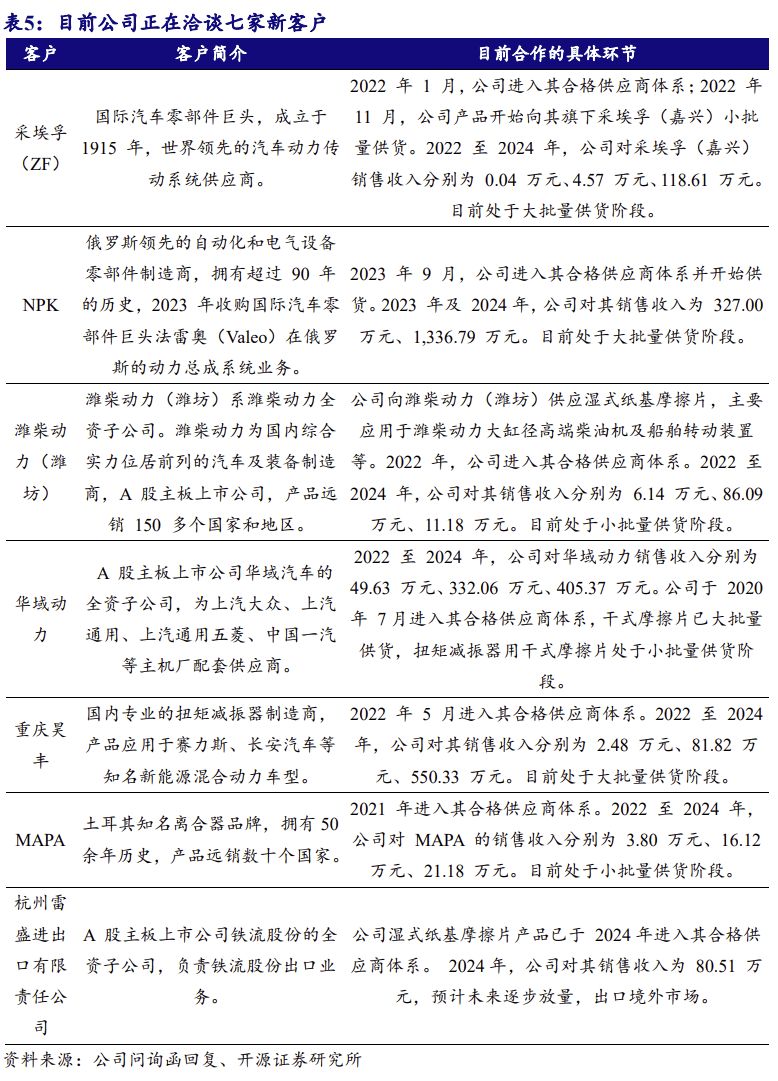 公司深耕干式摩擦片行业二十年,以优良的产质量量和优良办事,博得了国内 外浩繁客户的青睐,外行业内具有较好的口碑。公司客户包罗采埃孚(嘉兴)、法士 特伊顿、福达股份、浙江奇碟、一东、铁流股份、湖北三环、宏协股份、华域 动力、荣成黄海、奥德华等国内次要离合器出产企业。客户福达股份、一东、 铁流股份均为 A 股从板上市公司,系国内离合器次要出产企业和行业尺度的次要起 草单元;采埃孚(嘉兴)系国际汽车零部件巨头采埃孚(ZF)集团;法士特伊 顿为法士特齿轮取伊顿(Eaton)成立的合伙公司,出名传动系统零部件供应商;浙 江奇碟为中国汽车工业协会离合器委员会委员单元,产物配套国内出名从机厂;湖 北三环为工信部专精特新“小巨人”企业,多家汽车从机厂独家或次要配套商;宏 协股份为工信部专精特新“小巨人”企业,国度汽车零部件出口企业,具备完 善的国内结构和丰硕的出口经验;华域动力为 A 股从板上市公司华域汽车的全资子 公司,出名传动系统零部件供应商;荣成黄海为中国汽车工业协会离合器委员会理 事单元,持久专注于离合器的研发取出产;奥德华部门规格离合器市场拥有率位居 全国前列。