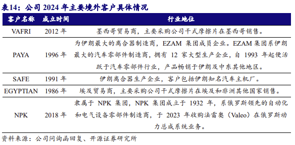 公司境外发卖营业次要由子公司杭州无为开展。杭州无为成立于 2009 年,2011 年成为刊行人全资子公司。2022 至 2024 年,公司次要出口产物为干式摩擦片,次要 出口产物取次要内销产物不存正在显著差别。公司次要出口国包罗墨西哥、伊朗、埃 及、俄罗斯等国度,次要境外客户包罗 VAFRI/ PAYA/SAFE/ EGYPTIAN/NPK ,取次要境外客户已成立不变的合做关系。2024 年占营收的比例别离为 4。99%、3。20%、 0。75%、2。33%、5。37%。