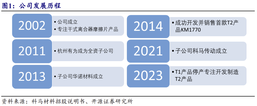 公司是工信部专精特新“小巨人”企业、浙江省“冠军”企业、企业尺度 “领跑者”。2002 年,公司成立,专注于干式摩擦片产物;2011 年,杭州无为成为 公司全资子公司,担任开辟国际市场;2013 年,子公司华诺材料成立,公司控制从 半成品骨架材料到干式摩擦片成品全套出产工艺;2014年,公司首款T2产物KM1770 开辟成功并对外发卖;2021 年,子公司科马传动成立,公司起头进入湿式纸基摩擦 材料范畴;2023 年 7 月,公司 T1 产物正式停产,专注于开辟制制愈加环保、机能 更优、附加值更高的 T2 产物。