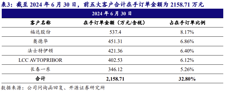 2024 年 6 月 30 日,公司正在手订单数量为 611。54 万片,正在手订单金额(含税) 为 6,581。60 万元。公司正在手订单前五大客户合计正在手订单金额(含税)为 2158。71 万元,占正在手订单的比例为 32。80%。