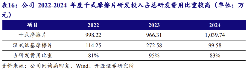 2022-2024 年度,公司干式摩擦片取湿式纸基摩擦片研发投入占总研发费用比沉较高,从侧面申明了产物具有必然的研起事度。