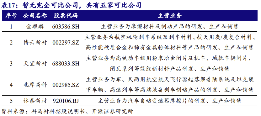 按使用范畴,摩擦材料能够分为制动摩擦材料和传动摩擦材料。干式摩擦片和 湿式纸基摩擦片属于传动摩擦材料,目前尚无境内上市公司专业处置干式摩擦片业 务并披露相关数据,出产和发卖制动摩擦材料的上市公司包罗金麒麟、博云新材、 天宜新材、北摩高科,林泰新材。林泰新材的次要产物为湿式纸基摩擦片。