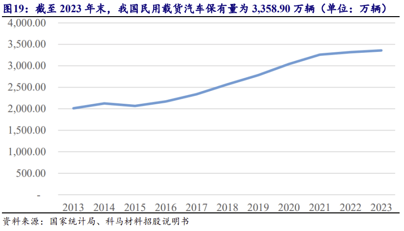 货车是支持商用车增加的次要车型。2022 年,国内货车产量为 277。8 万辆,销 量为 289。3 万辆;2023 年,国内货车产销量均为 353。9 万辆,别离同比上升 27。4%和 22。4%;2024 年,国内货车产量为 329。7 万辆,同比下降 6。85%,销量为 336。2 万辆, 同比下降 5。00%。2013 年以来,我国平易近用载货汽车保有量程度不竭提拔,截至 2023 岁暮,我国平易近用载货汽车保有量为 3,358。90 万辆。2013 年至 2023 年,我国平易近用载货 汽车保有量变更环境如下所示。
