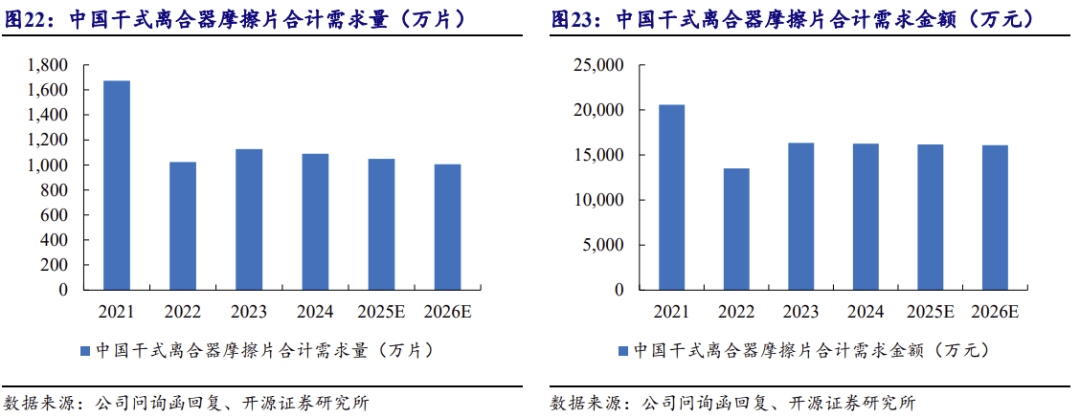 按照科马材料问询函测算,中国干式离合器摩擦片合计需求量估计 2026 年达 1,004。57 万片,中国干式离合器摩擦片合计需求金额 2026 年达 16,075。38 万元。