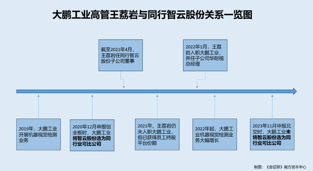2025年8月,关于深切实施“人工智能+”步履的看法发布,旨正在鞭策人工智能取经济社会各行业各范畴普遍深度融合。此番申报北交所的岛田大鹏工业股份无限公司(以下简称“大鹏工业”)系工业细密清洗范畴公用智能配备出产商。此中,2024年,大鹏工业机械视觉检测设备营业仅1,258。72万元,占从停业务收入的比例为4。76%。回溯汗青,2019年,大鹏工业结构机械视觉检测设备营业。此中,大鹏工业的子公司华耐视()智能检测无限公司(以下简称“华耐视”)次要处置机械视觉检测营业,王荔岩系华耐视的总司理。而王荔岩或未入职先受让员工持股平台份额,入职昔时,大鹏工业视觉检测设备营业收入大增,且其老店主系大鹏工业上次申报的可比公司。而2025年8月,王荔岩被认定为焦点员工之一,上市前夜获本次刊行参取计谋配售。别的,大鹏工业因存正在超产遭遭问询、扶植项目或上演“先上车后”异象或值得关心。2025年9月4日,人力资本社会保障部办公厅发布《企业实施竞业合规》,竞业事项再次吸引了的关心。2025年8月,大鹏工业过会次月召开的董事会议,决议将子公司总司理王荔岩等人认定为焦点员工,此中并授予王荔岩参取此次刊行的计谋配售。研究发觉,王荔岩曾于正在上次申报的同业任职,其或去职不脚1年即入职大鹏工业。值得留意的是,大鹏工业称王荔岩于2022年1月入职,首轮问询答复披露,2021年王荔岩即受让员工持股平台份额。据大鹏工业签订于2025年9月2日的招股仿单(以下简称“签订于2025年9月2日招股书),大鹏工业的控股子公司华耐视次要处置机械视觉检测设备研发及发卖。截至招股署日,王荔岩系华耐视总司理,其通过员工持股平台普拉特企业办理征询无限合股企业(以下简称“普拉特”)间接持有大鹏工业0。11%股权。据大鹏工业签订于2025年9月12日的第四届董事会第十次会议(姑且会议)决议通知布告,2025年9月11日,大鹏工业召开第四届董事会第十次会议(姑且会议)。会议上,大鹏工业审议并通过《关于提名并拟认定焦点员工的议案》、《关于公司高级办理人员及焦点员工拟设立专项资产办理打算参取向不特定及格投资者公开辟行股票并正在北交所上市计谋配售的议案》。内容次要系,鉴于大鹏工业拟申请于北交所上市,为了加强员工归属感,提高员工工做积极性,大鹏工业董事会提名王大亮、王荔岩、薛怡然、韩庆玲共4名员工为大鹏工业焦点员工。具体来看,大鹏工业部门高级办理人员及焦点员工拟通过设立专项资产办理打算的体例参取本次刊行计谋配售,该次配售比例不跨越该次拟公开辟行股票数量的10%,募集资金规模不跨越本次公开辟行股票数量的10%所对应的资金规模,且许诺本次配售的股票的限售期为12个月。该次参取专项资产办理打算人员共7名,别离为堂、李俊堂、周芝彬、王大亮、王荔岩、薛怡然、韩庆玲。此中,王荔岩系“焦点员工”。需要申明的是,据签订于2025年9月2日招股书,截至招股署日,堂系大鹏工业的现实节制人,堂取李俊堂系兄弟关系,且为分歧步履人。周芝彬系大鹏工业财政担任人及董事会秘书。由上可知,2025年8月,大鹏工业成功过会。次月,大鹏工业召开董事会并决议将王荔岩等4人认定为焦点员工,并决议大鹏工业部门高级办理人员以及焦点员工通过设立专项资产办理打算的体例参取本次刊行计谋配售,参取人员包罗王荔岩。1。2 王荔岩于2022年1月入职,首轮问询答复披露其正在2021年受让员工持股平台普拉特份额据签订日为2024年6月28日的首轮问询答复(以下简称“首轮问询答复”),2021年度,王荔岩向等4名员工转出31。5万元,资金性质为“受让普拉特份额”,资金来历为自筹资金。据市场监视办理局数据,普拉特成立于2016年3月31日。变动消息显示,2022年3月18日,、郭立明、超、杨福华退出普拉特,不再持股。同日,王荔岩新增成为普拉特股东。换言之,从市场监视办理局数据及招股手札披来看,王荔岩2022年1月入职大鹏工业,同年3月从等等人受让普拉特股份。而首轮问询答复披露,2021年,王荔岩向等4人转出31。5万元以受让普拉特份额,令人隐晦。1。3 王荔岩曾任子公司手艺部部长,官宣变动消息显示其于2021年4月不再担任智云股份子公司的董事截至查询日期2025年10月16日,据科技和学问产权分析办事平台于2023年10月28日的息,大鹏工业的总司理王荔岩曾任上市公司大连智云从动化配备股份无限公司(以下简称“智云股份”)副总司理。据智云股份签订于2016年4月7日的《股票期权激励打算激励对象名单》,截至2016年4月7日,王荔岩系智云股份子公司大连戈尔洁净化工程手艺无限公司(后改名为大连智云配备手艺无限公司,以下统称为“智云新能源”)的手艺部部长。据市场监视办理局数据,智云新能源成立于2011年12月15日。2016年5月9日起至查询日期2025年10月16日,智云股份均为智云新能源的股东,持股比例为100%。能够看出,正在首轮问询披露王荔岩2021年受让大鹏工业员工持股平台份额的布景下,2022年1月,王荔岩才入职大鹏工业。然而截至2021年4月前,王荔岩彼时担任智云股份子公司的董事。此番上市申报北交所,大鹏工业拔取的同业业可比公司别离为沈阳蓝英工业从动化配备股份无限公司(以下简称“”)、江苏联测机电科技股份无限公司(以下简称“联测科技”)、巨能机械人股份无限公司(以下简称“巨能股份”)、大连豪森智能制